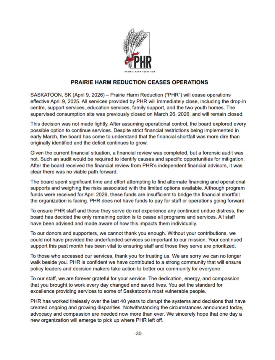 Prairie Harm Reduction ceased operations on April 9, 2025. All services provided by PHR have closed, including the drop-in centre, support services, education services, family support, and the two youth homes. The supervised consumption site was previously closed on March 26, 2026, and will remain closed.